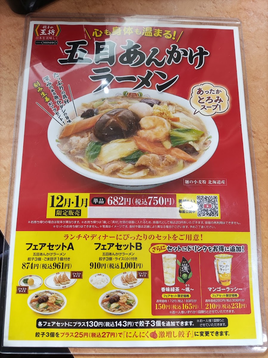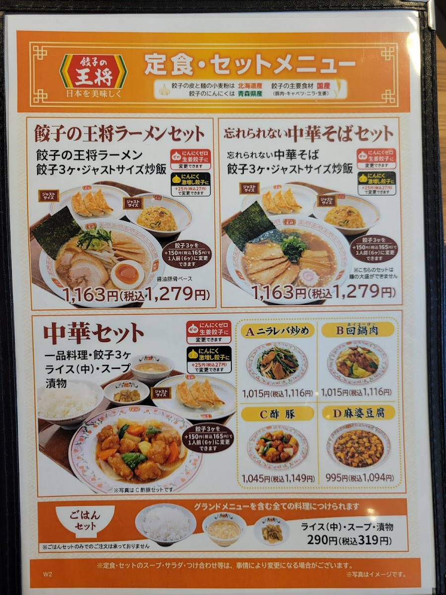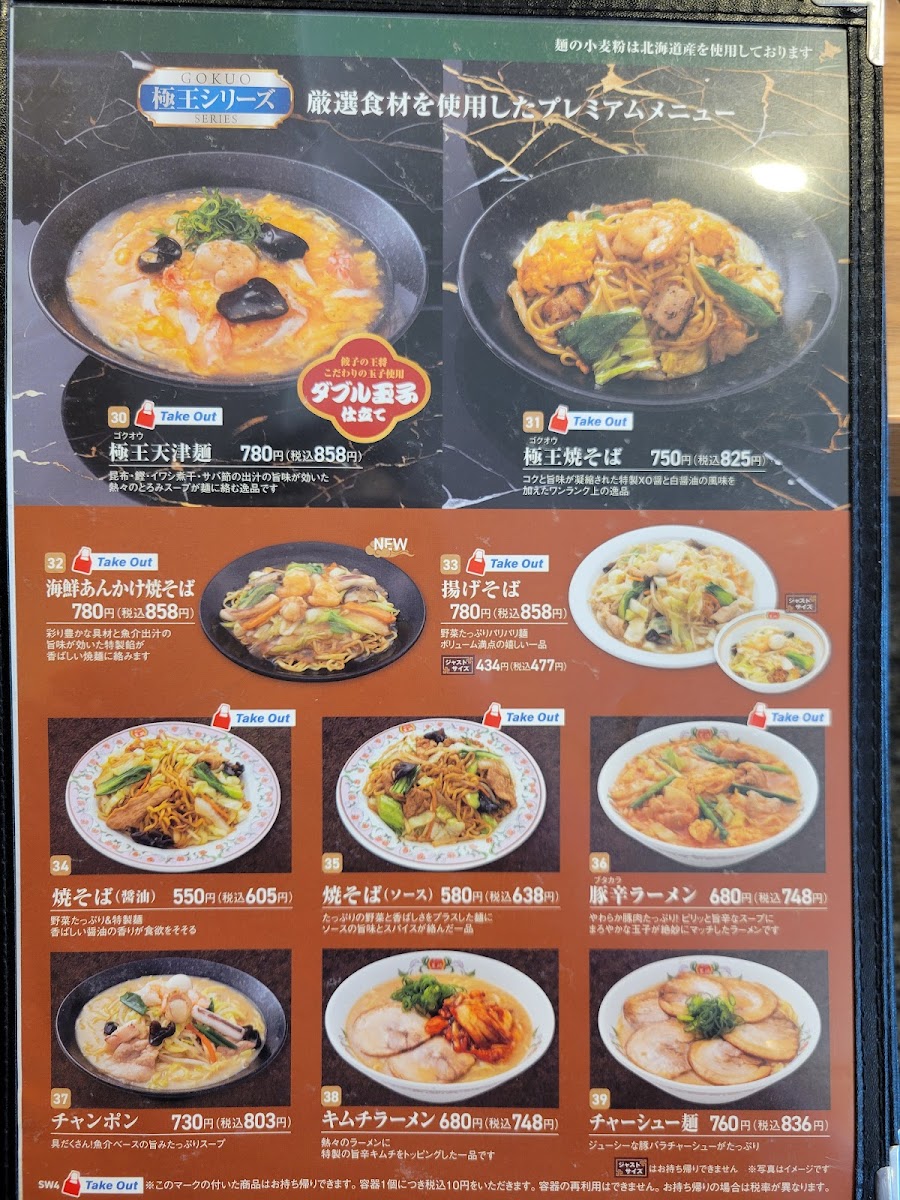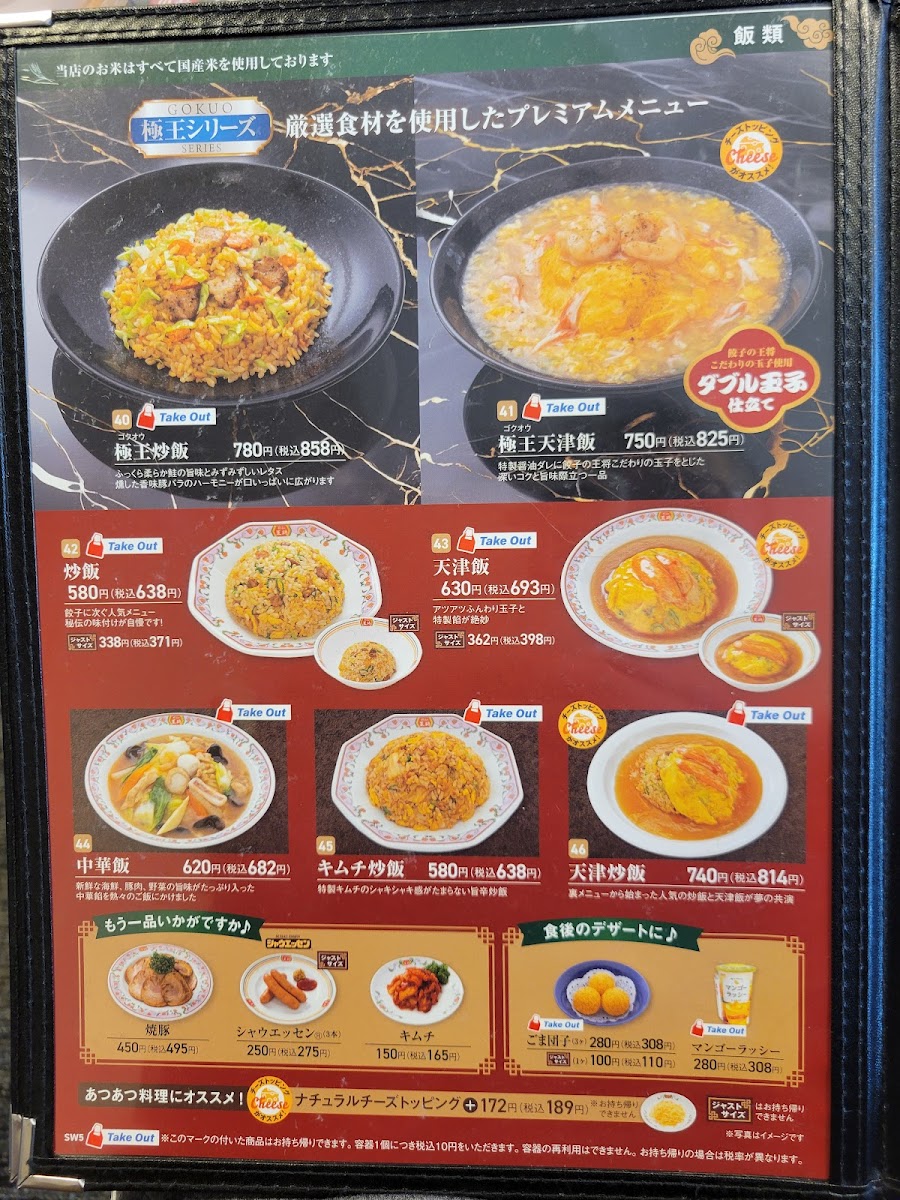 The menu at Gyoza No Ohsho offers a delightful array of traditional Japanese dishes, each bursting with authentic flavors and quality ingredients. Among the standout items, 焼き餃子 よく焼き (crispy pan-fried gyoza) is a must-try, expertly prepared with a golden-brown exterior that contrasts beautifully with the juicy, savory filling. For those craving a heartier dish, the 納豆チャーハン (natto fried rice) provides a unique combination of fermented soybeans and fluffy rice, while the 焼きそば (yakisoba) delivers a satisfying stir-fried noodle experience, enhanced with vegetables and savory sauce.